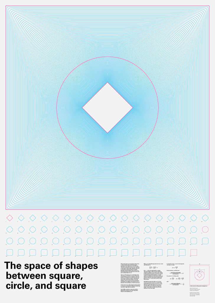 This project grew out of questions about how to draw nested ovals so that they appear consistent in the steps from one to the next. That led to discussions about ovals, which led to discussions about super ellipses, which led to discussions about the space of shapes between circle and square. We turned to our friend Patch Kessler who figured out the math and visualized these for us.